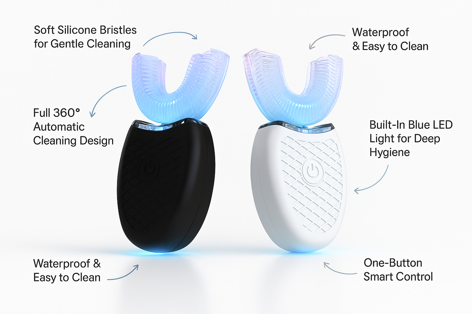 Its U-shaped design fits your mouth perfectly, brushing every surface evenly — without any effort.
