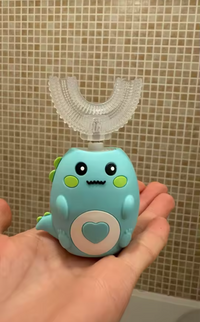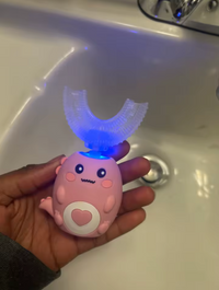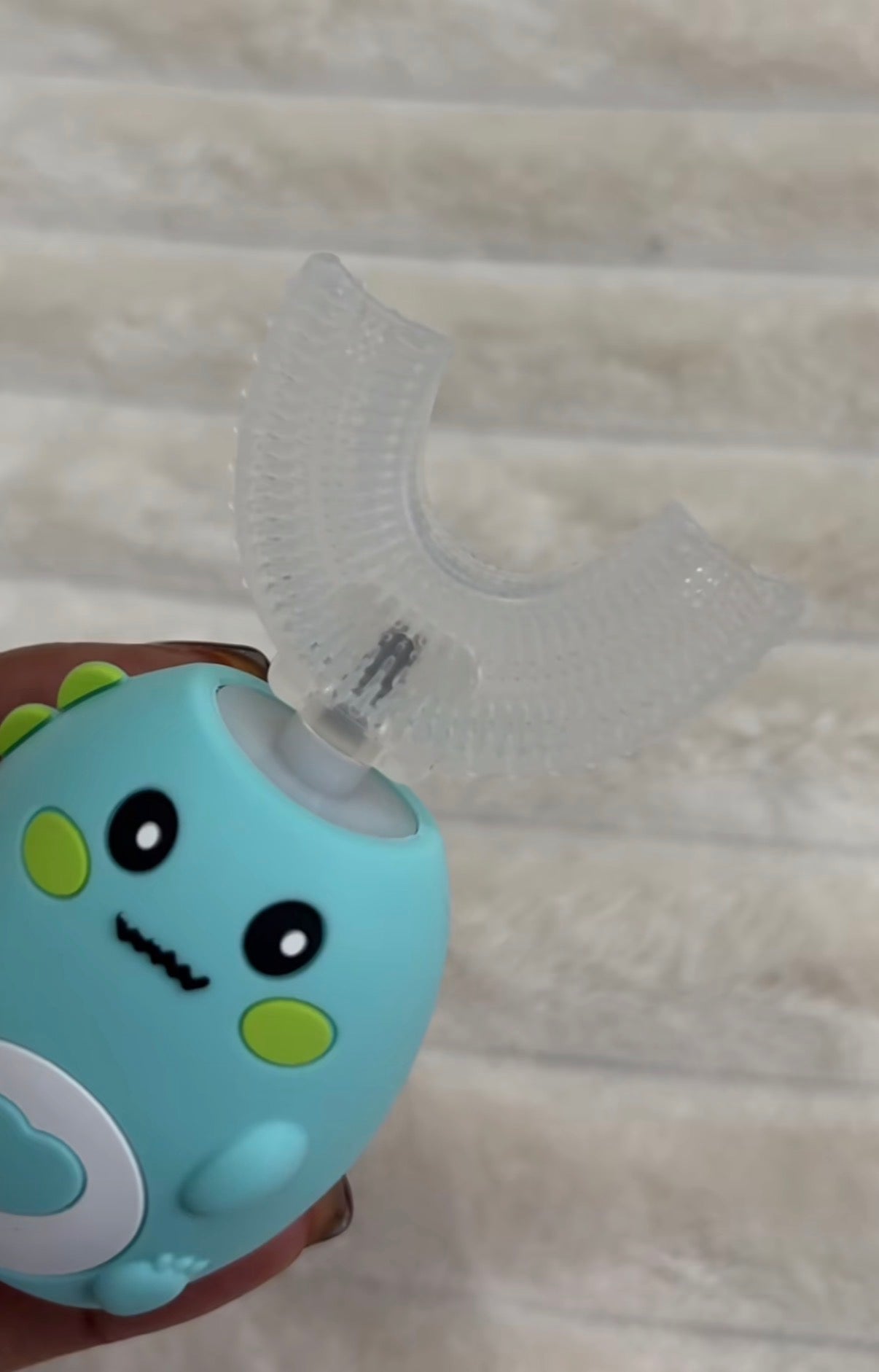 The U-shaped silicone head wraps around all teeth and cleans them at once. Simply add toothpaste, press the button, and let the sonic micro-vibrations do the work.